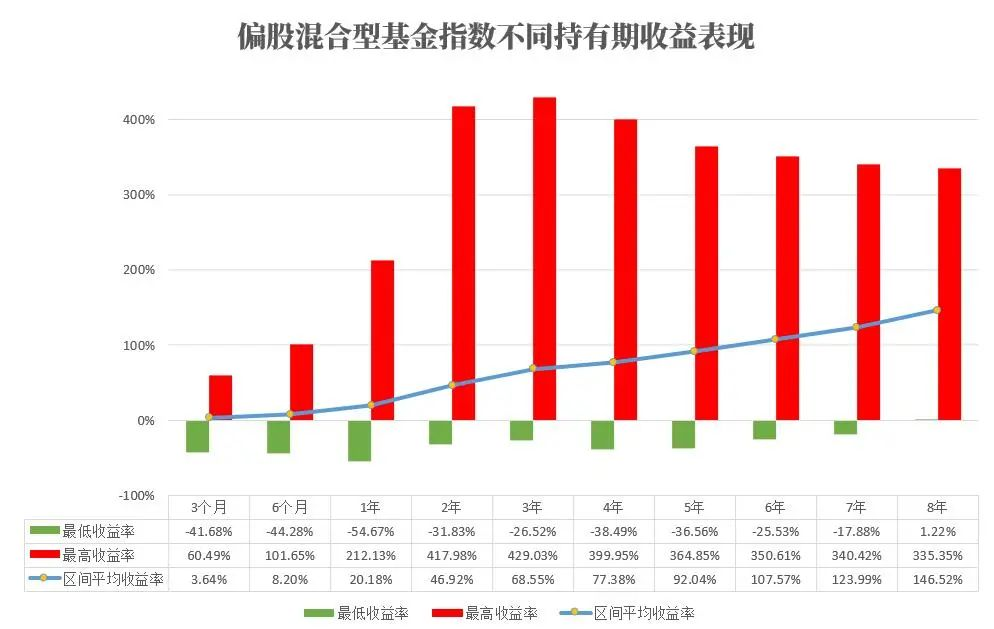 除了提升正收益的概率,我們投資基金自然也希望獲得更好的收益體驗。我們?nèi)砸云苫旌闲突鹬笖?shù)(Wind代碼:885001.WI)為例,統(tǒng)計從指數(shù)設(shè)立開始至2022年底近20年的數(shù)據(jù),任意一天內(nèi)買入該指數(shù),分別持有3個月、6個月、1年、2年、3年、5年、6年、7年、8年的平均收益率。